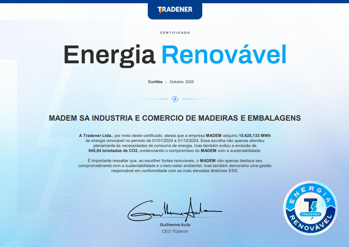 MADEM Brazil reaffirms its commitment to sustainability and ESG best practices upon receiving the 2024 Renewable Energy Certificate from Tradener Ltda., which certifies the consumption of 15,628 MWh of energy from 100% renewable sources between January and December 2024.